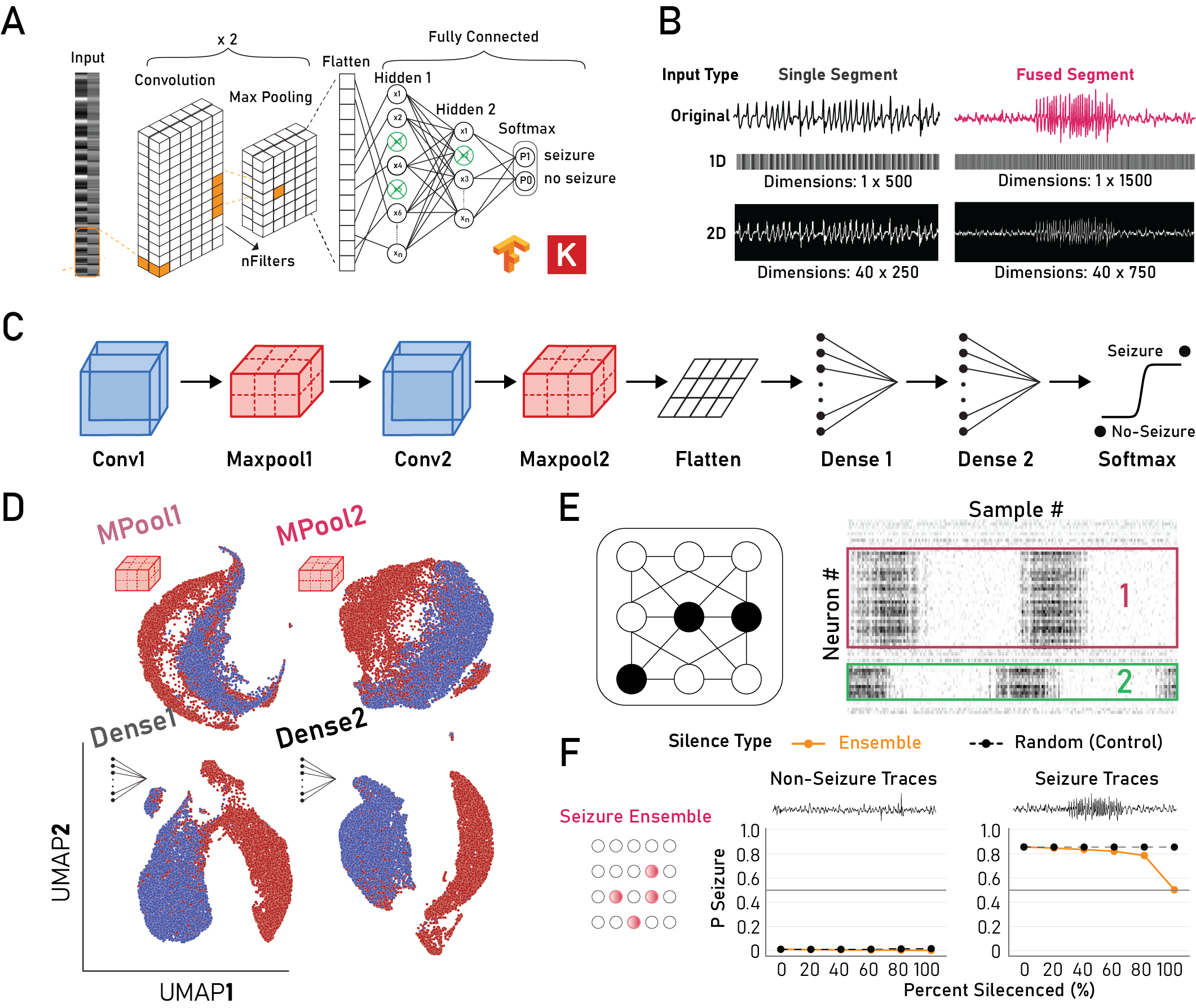 Figure: A) Model architecture, B) Input types, C) Model schematic, D) Separation of activations using PCA (nPCs=100) with UMAP, E) Ensemble identification strategy schematic, F) Silencing of seizure ensembles reduces model prediction to chance only for seizure traces.